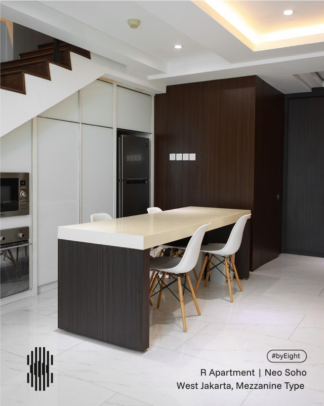 A sleek mezzanine-style apartment in West Jakarta, featuring a minimalist kitchen design with clean lines, modern finishes, and functional elegance for urban living.