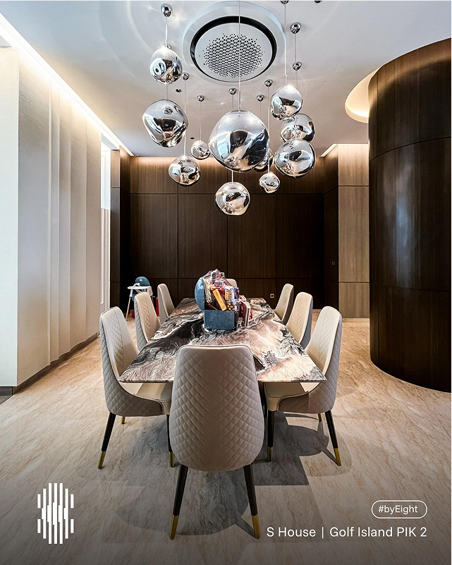 A modern dining space defined by sleek minimalism, elegant finishes, and a striking sculptural chandelier that elevates everyday living into a refined experience.